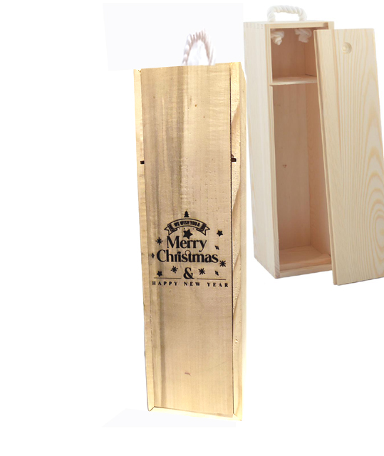 Дървена кутия за вино „Честита Коледа“, с плъзгащ се капак и дръжка от въженце.